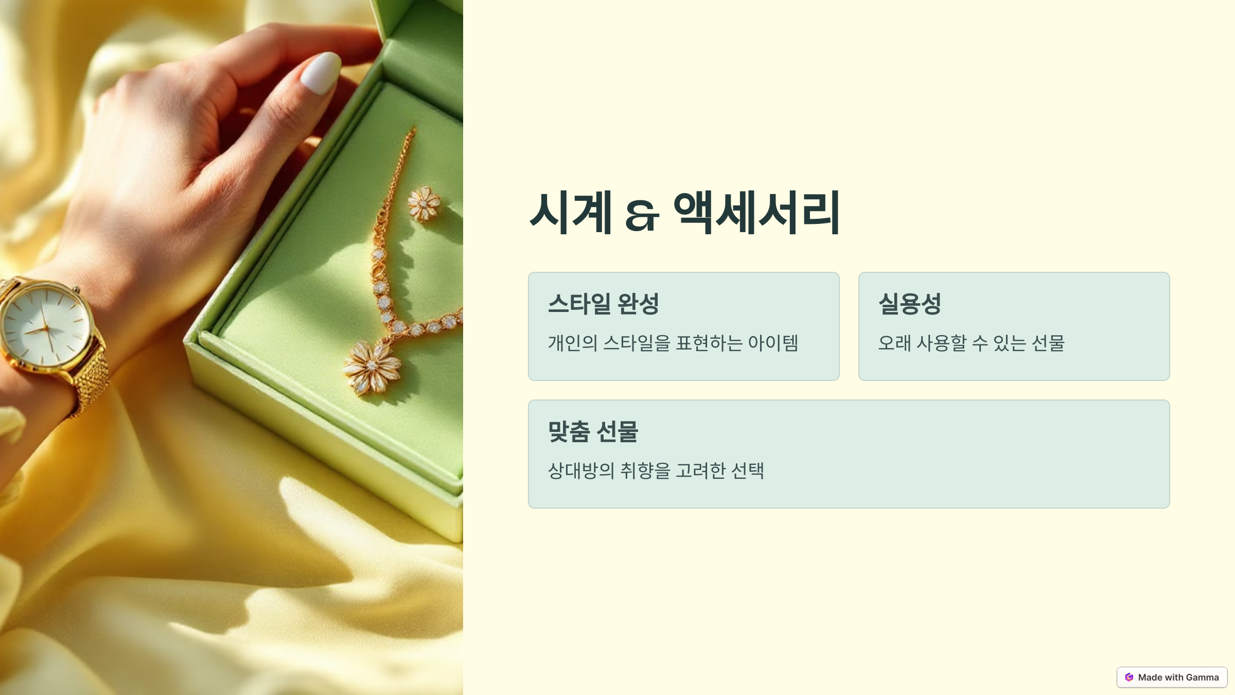 시계와 액세서리는 단순한 패션 아이템이 아닙니다. 개인의 스타일을 완성시키는 요소이며, 실용적인 선물이기도 합니다.📌 시계와 액세서리를 선물해야 하는 이유