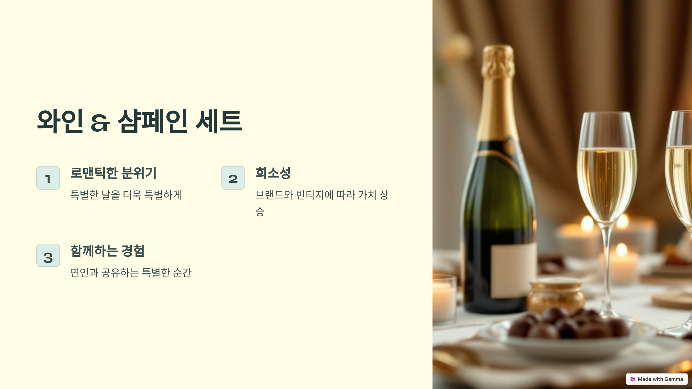 고급 와인이나 샴페인은 특별한 날의 분위기를 더욱 로맨틱하게 만들어 줄 수 있는 선물입니다.📌 와인 & 샴페인이 특별한 이유