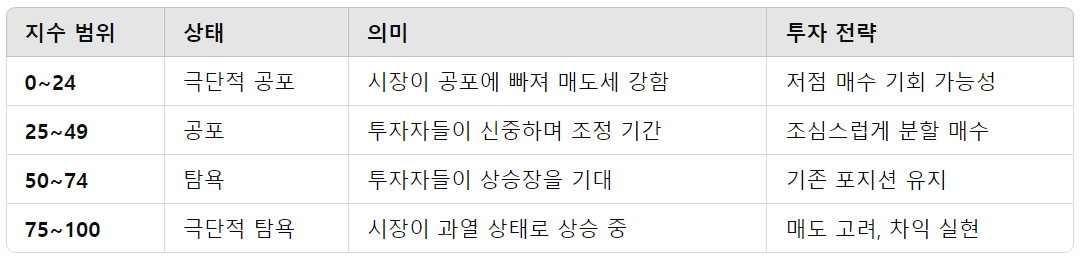 👉 투자자의 심리를 측정하여 시장 상황이 공포 상태인지, 탐욕 상태인지를 나타내는 지표입니다.
